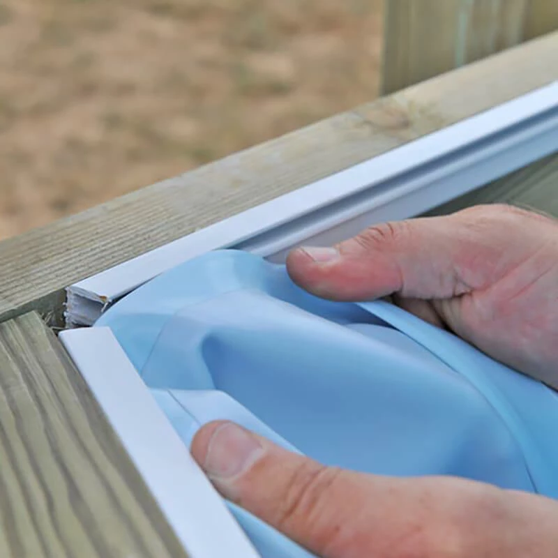Il sistema di fissaggio avviene tramite sistema beaded, che consiste nell’appendere il liner sul profilo superiore della piscina tramite una fettuccia in pvc saldata sul bordo esterno.