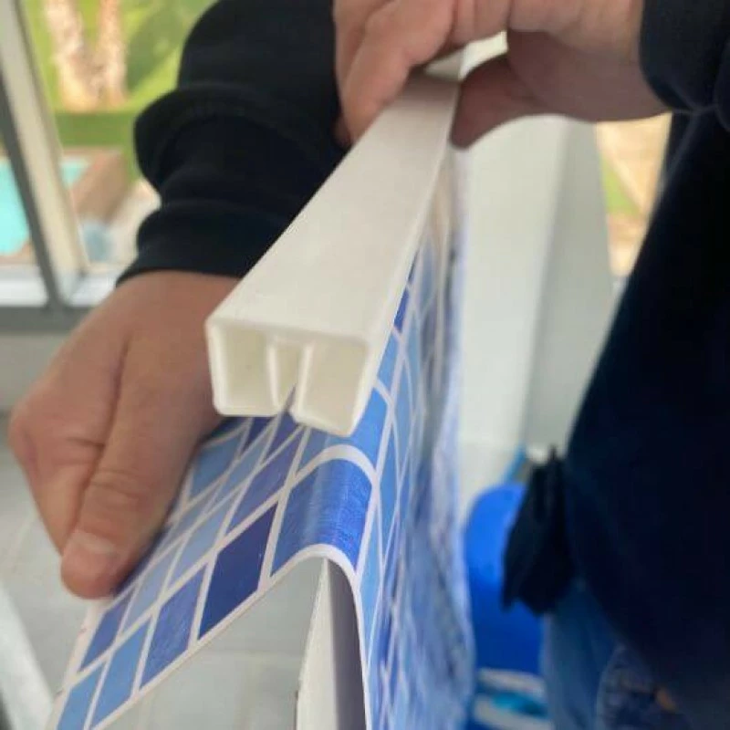 Al momento del fissaggio la parte in eccesso, che cadrà sulla parte esterna della piscina, potrà essere tagliata e solo in seguito sarà possibile fissarlo per mezzo dei profili superiori sul bordo della vasca.