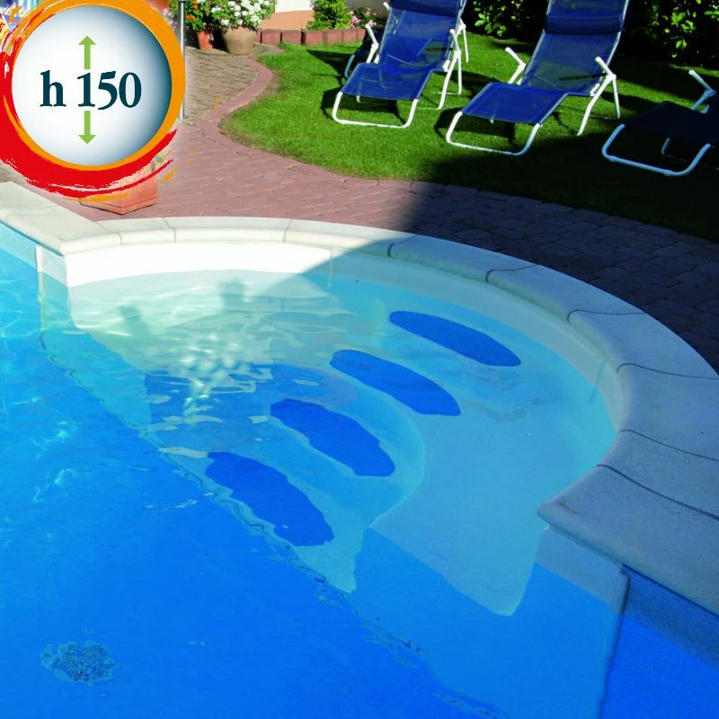 Piscina privata interrata da giardino in pannelli d’acciaio con una lunghezza di 8 mt. ed una larghezza di 4 mt. L’altezza della struttura è di 1,50 mt. con un’altezza del livello dell’acqua di 1,40 mt. I pannelli di ferro zincati prodotti in Germania, provengono dall’esperienza utilizzata in ambito automobilistico ed hanno un’elevata resistenza alla corrosione e grazie a questo presupposto, viene fornita una garanzia sulla struttura di 10 anni contro danni da ruggine, mentre la scala romana, di colore bianco, è realizzata in poliestere termoformato molto solido con la scalinata in abs di colore azzurro. La piscina è corredata da due skimmer americani (a bocca larga); 4 valvole di ritorno; una presa di fondo; una scaletta in acciaio inox AISI 304 a 4 gradini; un kit di pulizia completo di testa aspirafango, termometro, tester, retino di superficie, asta telescopica e tubo per il collegamento allo skimmer; tappeto soft-walk per una maggiore sensazione di piacere durante l’appiedamento in piscina o meglio aiuta a prevenire danni durante qualche tuffo se qualcuno dovesse battere al suolo; kit di filtrazione Hayward da 10 m3/h completo di 100 Kg. di sabbia quarzifera e tubazione con relativa raccorderia necessaria per l’assemblaggio della parte idraulica; N° 2 fari a Led luce bianca. Inoltre la piscina viene fornita con liner a sacco in modo che l’installazione possa essere eseguita anche da personale poco esperto con il criterio “fai da te”, poichè questo potrà semplicemente essere agganciato e non dovrà essere termosaldato sul posto da personale qualificato.