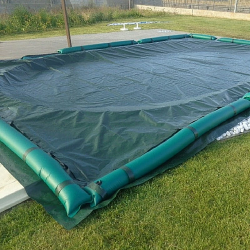 Copertura invernale per piscina da giardino interrata Il telo di copertura invernale per piscine interrate con tubolari perimetrali è il sistema più collaudato per coprire la vostra piscina nel periodo di inutilizzo. Il sistema consiste nel riporre lungo il perimetrale dei salsicciotti che vengono riempiti con dell’acqua e creano quindi quel peso necessario a far sì che il telo non consente di prendere aria e luce all’acqua dell’a piscina, oltre a ripararla dalle interperie della stagione invernale.