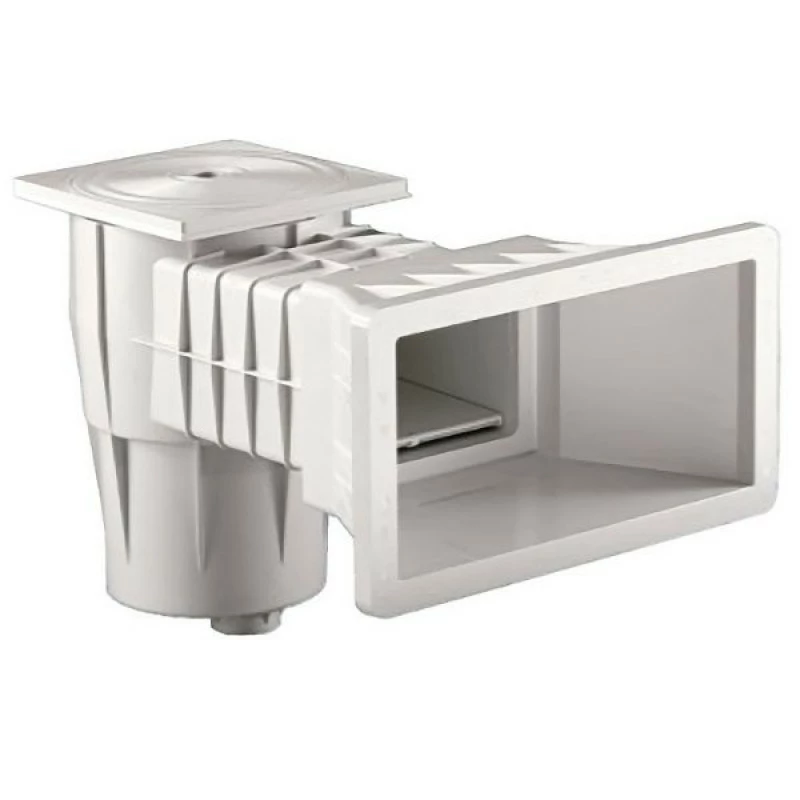Lo skimmer a bocca larga presenta un corpo in ABS bianco con rilievi per favorire l’ancoraggio nella struttura di cemento della piscina interrata. Nella parte interna è presente uno sportellino battente galleggiante antirumore che consente lo sfioro in superficie dell’acqua indipendentemente dal suo livello e trattiene le impurità raccolte nel cestello a impianto spento.